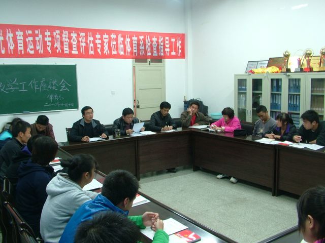 11月11日晚7:30,体育系召开了普通专业学生教学工作座谈会,副主任鲁宗成、公共体育教研室主任吕仙利、教学秘书易红君和2009级普通专业本科班体育委员17人参加了会议。