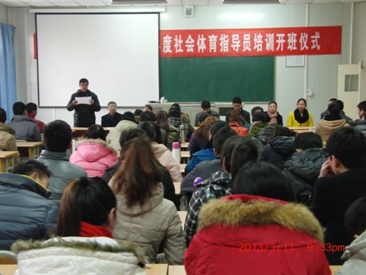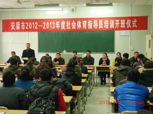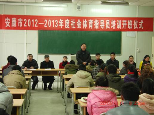 2013年1月12日上午9:00,安康市2012-2013年度社会体育指导员培训班开班典礼在欧冠官网举行。安康市体育局党组成员、纪检组长陈复勇、安康团市委副书记梁鸿、安康市体育局群体科科长朱小燕、欧冠官方网站体育系主任冯德学、欧冠官方网站体育系副主任鲁宗成等领导以及部分授课教师和全体学员共一百余人参加了开班典礼,典礼仪式由欧冠官方网站体育系党总支书记沈军主持。