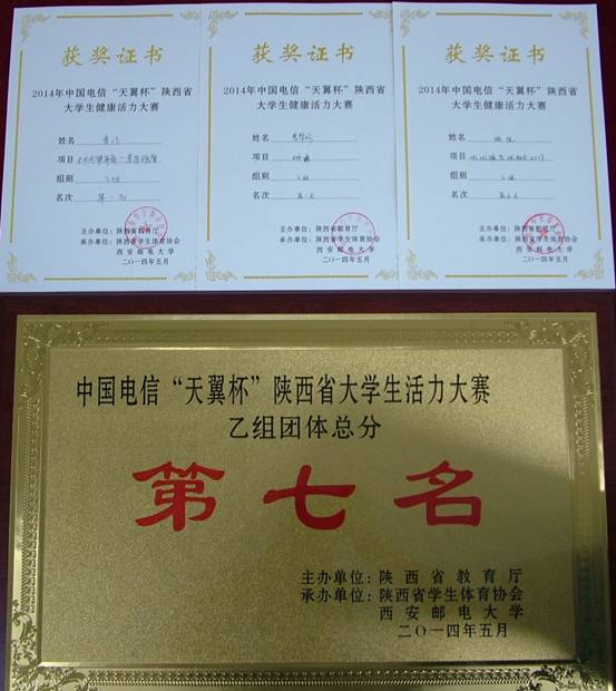 陕西省大学生健康活力大赛于2014年5月29—30日在西安邮电大学体育馆举行,来自全省49所高等院校的1120名运动员参加了比赛。欧冠官网14名健美操精英组队参加了体育院系及高水平组(共九个院校)比赛,经过奋力拼搏和出色发挥,欧冠官网报名参加的中国风健身舞——草原雄鹰获得第一名、排舞获得第二名、啦啦操花球规定获得第三名的优异成绩,团体总分排体育院校及高水平组第七名,曾洁同学被评为大赛“优秀运动员”。