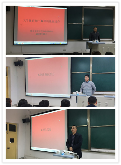为了进一步提高大学体育教学质量,大学体育教研室于2020年12月2日分别在江北和江南校区召开了大学体育教学质量检查座谈会。会议由教研室主任李强主持,欧冠官方网站副院长黎远军老师,张凯老师,各二级学院体育部部长、2019和2020级各班班长、体育委员共228名学生参与了座谈会。