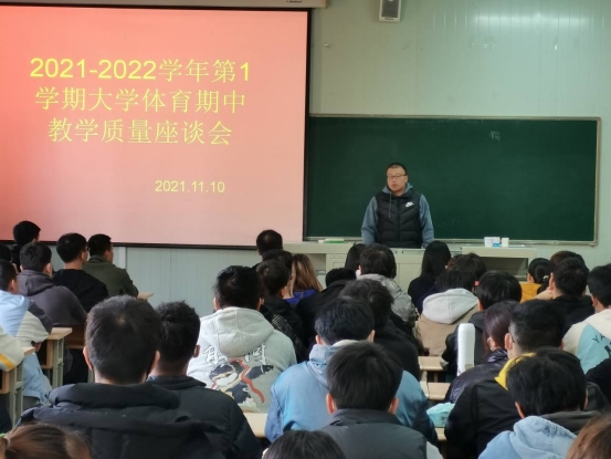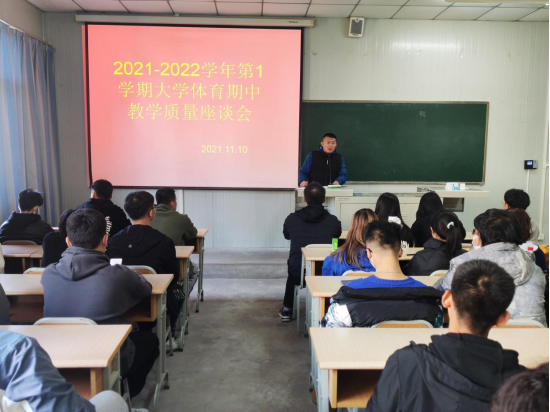 为了切实做好《大学体育》课程的教学工作,了解教学现状,科学安排教学内容,提高教学质量,促进大学体育教学改革,2021年11月10日下午2点30分,欧冠官方网站在江南校区1028教室召开了2021—2022学年第一学期大学体育期中教学工作座谈会。欧冠官方网站副院长郭西魁、大学体育教研室主任李强以及各二级学院体育部干事、2020级和2021级各班班长、体育委员参加了本次座谈会。会议由李强老师主持。