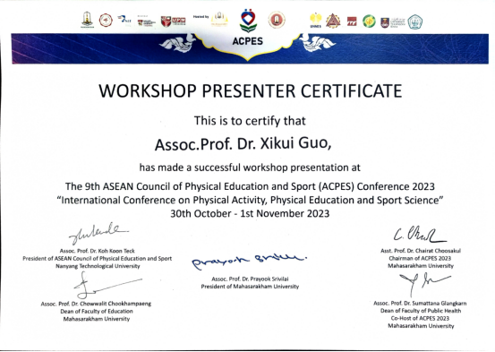 10月30日-11月1日,东盟体育运动理事会(ACPES)2023年“体育活动、体育教育和运动科学”国际会议,在泰国玛哈沙拉堪大学举行,欧冠官网教师郭西魁副教授应邀参加此次会议,并在会上以“太极拳在全民健身和学校体育的发展”为题进行了交流发言,深入浅出的介绍了我国的太极文化和太极拳健身功能,给来自东南亚的参会者们宣讲了中国太极文化,并进行了友好交流,受到与会国际友人欢迎。