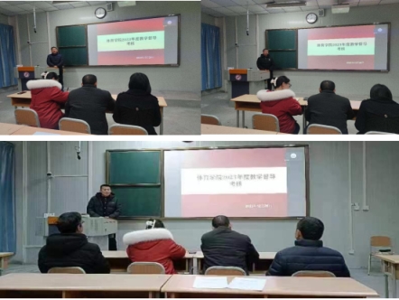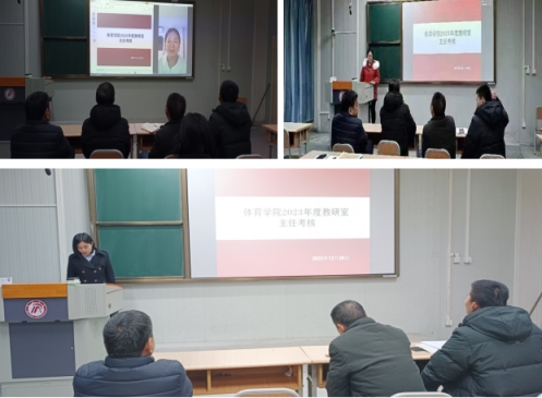 欧冠官方网站领导班子高度重视考核工作,成立了考核小组,制定了考核方案,在本次专题考核会上分三个批次进行考核。首先,对欧冠官方网站课程群负责人进行了考核,球类课程群负责人崔晓宇、操舞类课程群负责人陈治强、运动人体科学课程群负责人刘芹和学校体育学课程群负责人赵娇艳分别进行了年度总结汇报,考核组通过听取汇报、座谈和查阅工作记录的方式进行考核,并针对本年度工作中存在的不足对三位课程群负责人进行了现场反馈,并提出了下一步工作建议。