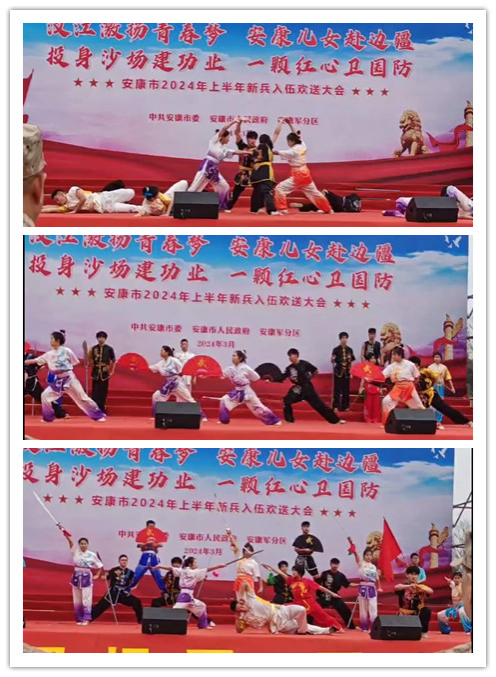 3月16日上午,安康市2024年上半年新兵入伍欢送大会在金州广场隆重举行。市委常委、军分区大校司令员王军贤、副市长周耀宜、军分区大校政治委员徐云伟出席欢送会。我院武术队应邀参与表演。