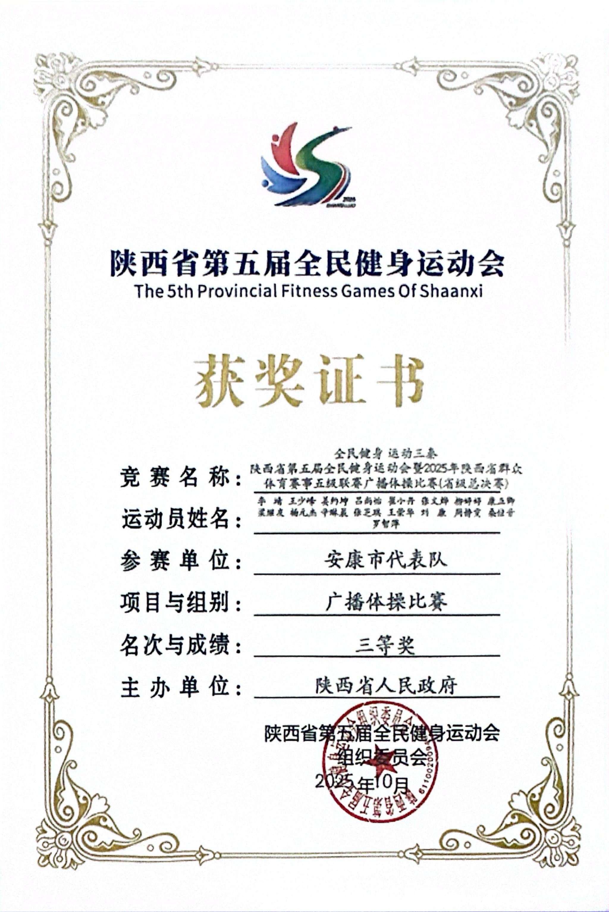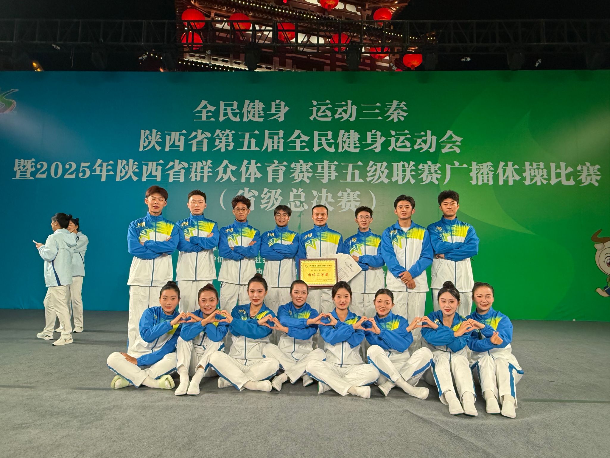 10月13日晚上,由陕西省人民政府主办的陕西省第五届全民健身运动会暨2025年陕西省群众体育赛事五级联赛广播比赛(省级总决赛)在商洛市望江楼广场圆满落幕,欧冠官网师生组成的安康市代表队斩获广播体操比赛团体三等奖。