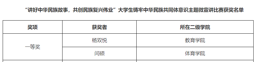 9月20日下午,学校在江南校区图书馆六楼报告厅举办了“讲好中华民族故事,共创民族复兴伟业”大学生铸牢中华民族共同体意识主题微宣讲比赛,欧冠官网体育教育专业2023级1班学生闫硕获一等奖。