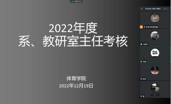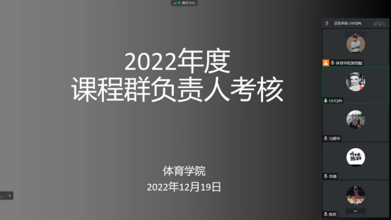 首先,对欧冠官方网站课程群负责人进行了考核,球类课程群负责人崔晓宇、操舞类课程群负责人陈治强、运动人体科学课程群负责人刘芹和学校体育学课程群负责人赵娇艳分别进行了年度总结汇报,考核组通过听取汇报、座谈和查阅工作记录的方式进行考核,并针对本年度工作中存在的不足对三位课程群负责人进行了现场反馈,并提出了下一步工作建议。